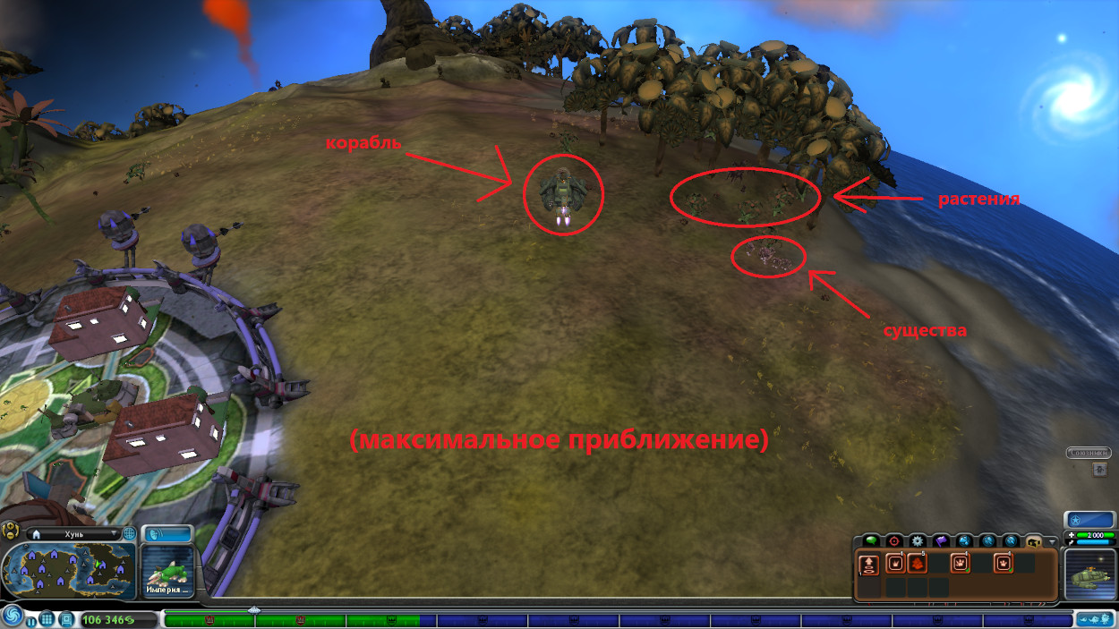 Планеты. Казалось бы, планеты... Отправляясь на другие планеты, ожидаешь, что на них можно будет как на своей родной играть в любой из предыдущих этапов - высадиться от третьего лица, управлять существом напрямую. Ничего подобного. Сами планеты по своему масштабу крошечные. Если на родной планете в ходе прохождения можно было встретить десятки различных существ, с которыми можно было взаимодействовать, то на других - максимум шесть травоядных и три хищника.